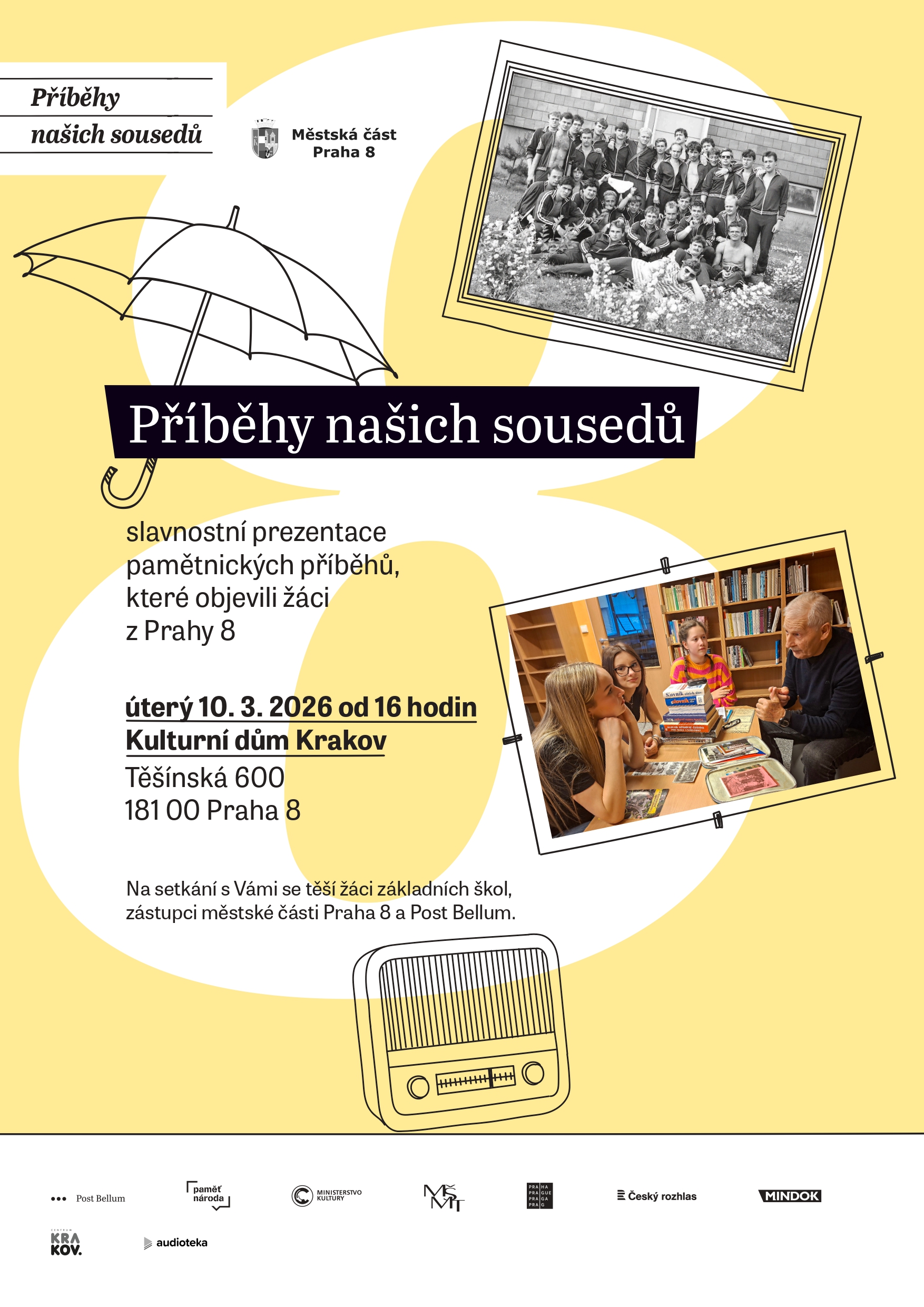 Přijďte se podívat na závěrečnou prezentaci projektu Příběhy našich sousedů! Tento vzdělávací projekt neziskové organizace Post Bellum je určen pro žáky a žákyně 8. a 9. tříd základních škol. Mají za úkol vyzpovídat pamětníky, natočit vzpomínky a pak kreativně zpracovat. Týmy zde své práce představí odborné i široké veřejnosti a nabídnou jedinečný pohled na příběhy lidí, kteří žijí kolem nás.